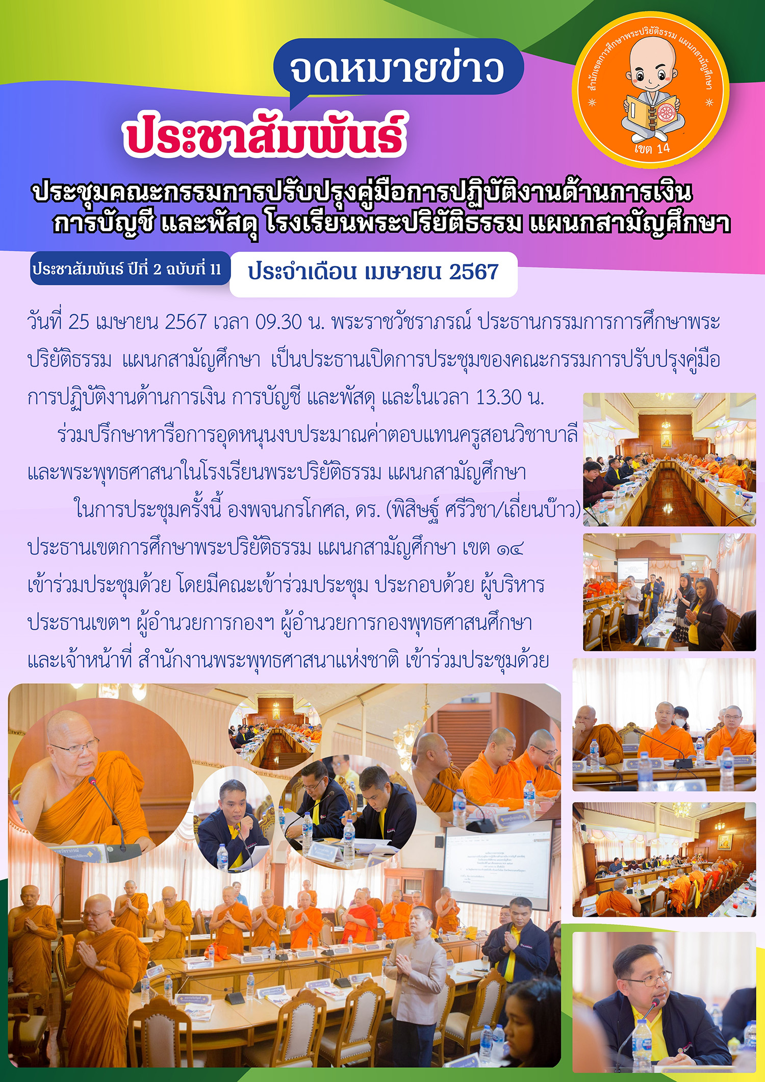 คณะผู้บริหารสำนักงานการศึกษาพระปริยัติธรรม แผนกสามัญศึกษา (สศป.) ได้เข้าร่วมประชุมกับคณะกรรมการที่เกี่ยวข้อง เพื่อดำเนินการปรับปรุงคู่มือการปฏิบัติงานด้านการเงิน การบัญชี และพัสดุของโรงเรียนพระปริยัติธรรม แผนกสามัญศึกษา ให้มีประสิทธิภาพยิ่งขึ้น