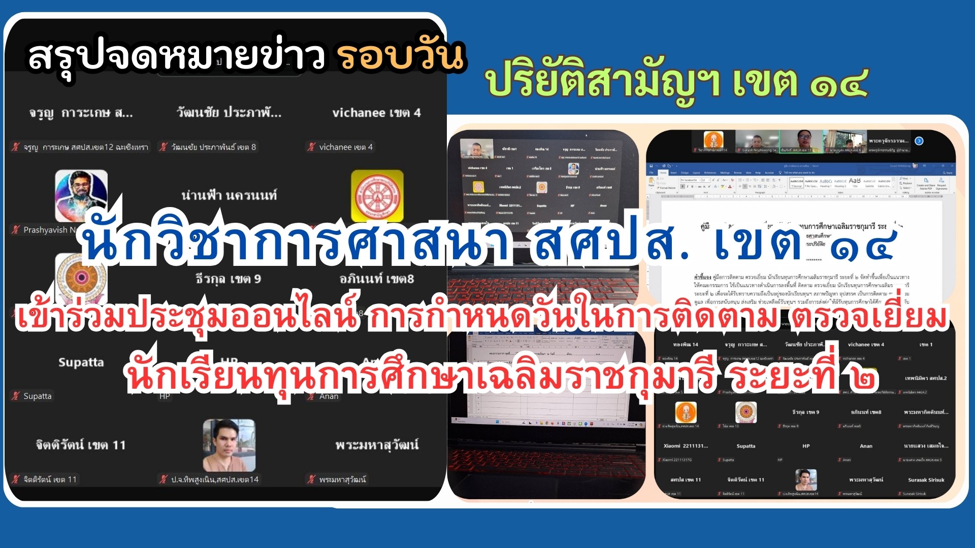 เมื่อวันที่ ๑ กรกฎาคม ๒๕๖๗ เวลา ๑๓.๓๐ น. นักวิชาการศาสนา สำนักเขตการศึกษาพระปริยัติธรรม แผนกสามัญศึกษา เขต ๑๔ เข้าร่วมการประชุมออนไลน์ (Zoom Meeting) เรื่องการกำหนดวันติดตาม ตรวจเยี่ยมนักเรียนทุนการศึกษาเฉลิมราชกุมารี ระยะที่ ๒